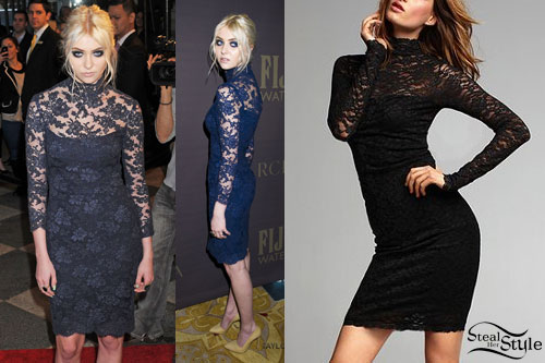 Taylor Momsen may wear ripped tees most days, but she proved that she can still look elegant when she wants to at Marchesa’s Fall 2012 fashion show. Taylor wore a blue lace Marchesa dress with a sheer chest and sleeves and a turtleneck collar. You can get Taylor’s look for less with the Lace Dress from Victoria’s Secret ($79.50), which comes in both black and blue.