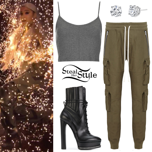 In another shot Ariana is seen wearing a Topshop Petite Strappy Seam Bralet (Sold Out), Alexander Wang High-Waisted Multi-Pockets Trousers ($748.00), Harry Kotlar Classico Diamond Stud Earrings ($39,760.00) and Casadei City Rock Platform Ankle Boots (Sold Out).