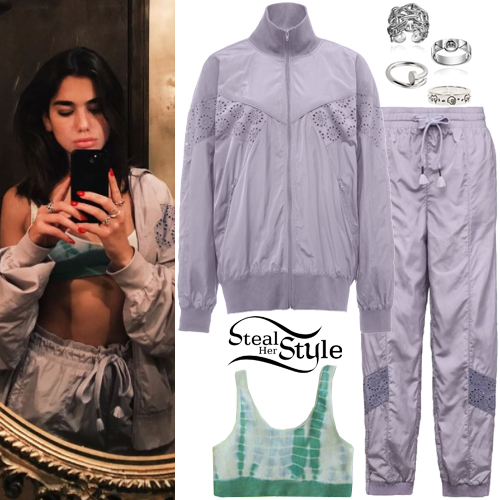 Dua Lipa shared some photos wearing Gucci Tie-Setailed Silk-Georgette Blouse ($1,593.00), Marques Almeida Embeoidered Denim Bootcut Jeans ($468.00), Martha Calvo Kylie Earrings ($140.00), Small Soufflé Bag ($5,800.00) and Keyhole Pumps ($2,200.00) both by Schiaparelli.
