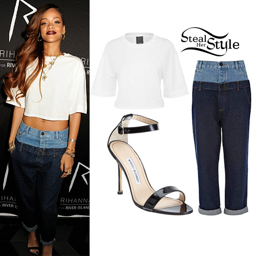 Rihanna shared some pictures on instagram wearing Rick Owens Metallic Bikini Top (Sold Out), a Dries Van Noten Draped Metallic Silk-Blend Lamé Maxi Skirt ($990.00), a Elizabeth Gage Peridot Heliotrope Ring (Not available online), and Amina Muaddi x AWGE LSD Gladi Thigh High Heel ($1,860.00).