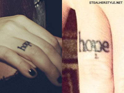 Brandi Cyrus has “hope” tattooed on her knuckle on her left ring finger. It is written in lowercase letters in a serif font.