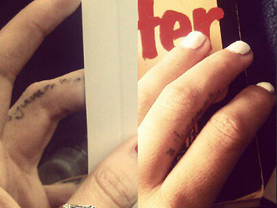 The tatoo on her middle finger says Babyumm its what she calls her boyfriend.