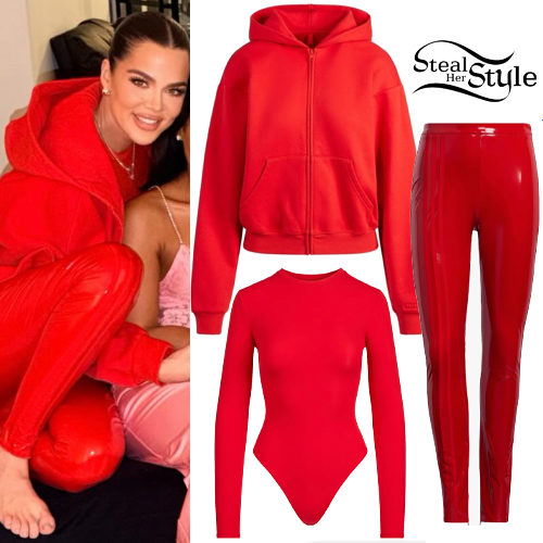 Khloé Kardashian celebrated Valentine’s Day wearing Skims Long Sleeve Crew Neck Bodysuit ($70.00) and Skims Classic Zip Up Hoodie ($56.00 – wrong red available but you can also find a similar hoodie at Khy $50.00) with Red Latex Pant by adidas x IVY Park (Sold Out).