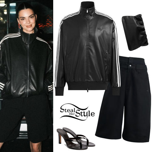Kendall Jenner attended an Adidas event wearing Faux Leather Adicolour 3-Stripes Loose Firebird Tracksuit Jacket (Sold Out) and Firebird Utility Jorts (Sold Out) both by Adidas with Large Bourse Clutch ($1,950.00) and Sacha Heel Thong Sandals ($1,030.00) both by The Row.
