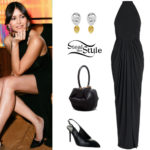 Nina Dobrev arrives at the 2nd Annual Environmental Media Association Honors Benefit Gala wearing a Michael Kors Daisy-Embroidered Crepe Midi Dress ($8,900.00), a Clemmie Satin Clutch Bag ($1,695.00 – available in python) and Minny Strappy Leather Sandals ($750.00) both by Jimmy Choo.