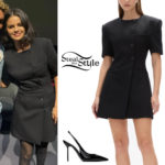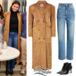 Selena Gomez posed with a fan in Malibu wearing Aritzia Ellipsis Luxe Cashmere Tank ($43.99 – wrong color), , Fendi Sequin Baguette ($3,600.00), Regard Sombre Celiane Sunglasses (€180.00), Yvonne Leon Collier Riviere Escargot Diamants or Jaune (€8,950.00) and earrings that look like the Anthropologie Triple Wave Post Earrings ($38.00).