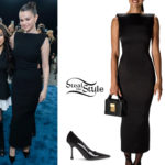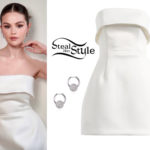 Selena Gomez attended the MTV Video Music Awards wearing custom-made Oscar de la Renta dress (Not available online), Giardini Segreti Flower Earring (€37.380,00 each), Giardini Segreti Earring (€24.780,00 each), Giardini Segreti Double Flower Ring (€32.000,00), Giardini Segreti Petit Flower Ring ($4,900.00 – wrong color), Giardini Segreti Flower Bracelet (€27.890,00) all by Pasquale Bruni, Roger Vivier Silk Clutch Bag (Sold out) and Jimmy Choo Minny Satin Sandals (Not available online).
