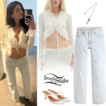 Kylie Jenner attended Coachella last weekend wearing Khy Baby Tee ($42.00), Abra White Body Jeans ($425.00 – wrong color), Nahmias Miracle Academy Hat Camouflage ($230.00) and vintage Ralph Lauren Navy White Polka Dot Mini Bag (Sold Out).