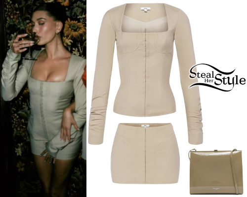 Hailey Baldwin attended a Khy event wearing Long Sleeve Corset Top ($268.00) with Mini Corset Skirt ($248.00) by Khy x Dilara Findikoglu and Saint Laurent Le Anne Marie Bag ($3,249.00).