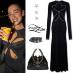 Dua Lipa posed with friends wearing Valentino Garavagni Jaguar Spots Printed Wool Cloth Caban ($6,900.00), Celine Marco Jeans ($1,200.00), Bottega Veneta Mini Loop Camera Bag ($2,300.00), Lock Ring in Yellow Gold ($1,300.00), Lock Ring in Yellow Gold with Diamonds ($6,100.00), Knot Double Row Ring with Diamonds ($7,500.00) all by Tiffany & Co. SHAY Diamond Baguette Pave Pinky Ring ($6,500.00), Serpenti Viper Ring ($2,530.00) and Serpenti Viper Diamond Ring ($11,300.00) both by Bulgari.
