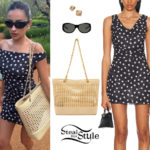 Shay Mitchell shared some pictures on instagram wearing Adriana Degreas Body Coquille De Mer ($410.00), Tagliatore B-Effie Shorts ($205.00), Saint Laurent Croc-Effect Leather Belt ($600.00), Lauren Leather Bag ($4,400.00) and Classic Aviator Sunglasses ($770.00) both Bottega Veneta, Arielle Baron Narcissus 55 Heels (Sold Out).