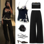 Selena Gomez appeared on ABC’s Match Game wearing Miu Miu Bow-Detailed Mini Dress ($2,579.00), Agapée Giulia Earrings ($108.00) and Andrea Wazen Nora Pumps ($870.00).
