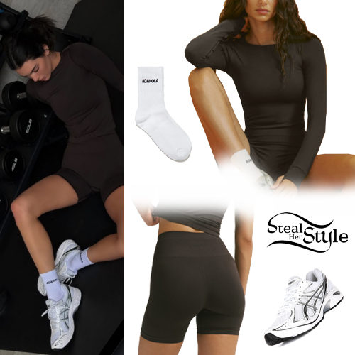 Kendall Jenner share some photos on instagram wearing Impact Seamless Long Sleeve Top ($75.00) and Impact Seamless Crop Shorts ($70.00) with White Socks ($16.00) all by Adanola, and Asics GT 2160 Sneakers available at Cettire ($136.24) and Farfetch ($196.00).
