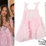 Chrissy Teigen shared some photos on instagram wearing a Monique Lhuillier Metallic Gold Sculpted Mini Dress ($6,319.00), Valentino San Fin Earrings ($1,590.00) and Gianvito Rossi Diana 85 PVC Slingback Pumps ($995.00).
