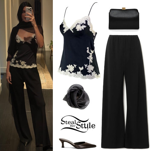 Kendall Jenner shared some photos on instagram wearing vintage F/W 1998 Christian Dior by John Galliano Black Silk Lace Trim Camisole Blouse (Sold Out), Gala Pants ($1,090.00), Milette Silk-Organza Head Scarf (Sold Out), Amazon Leather Clutch (Sold Out) and Cibyl Mule ($920.00) all by The Row.