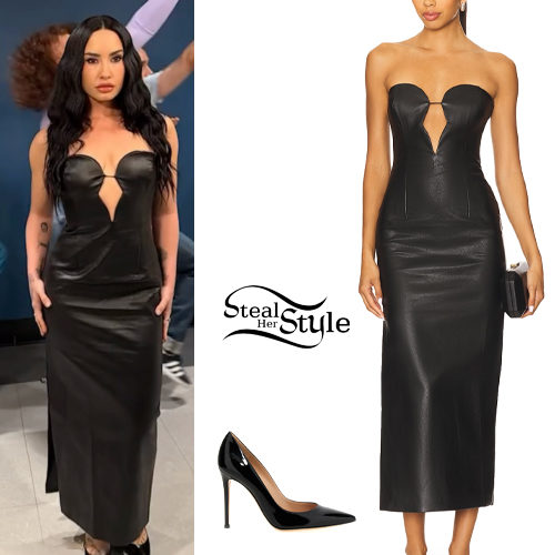 Demi Lovato appeared on The Tonight Show starring Jimmy Fallon wearing Bardot Eleni Faux Leather Midi Dress available at Nordstrom ($78.50), FWRD ($159.00) and ASOS ($165.60) with Gianvito Rossi Patent Leaather Pumps ($850.00).