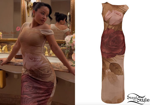Cierra Ramirez shared some photos on instagram wearing Pretty Little Thing Rose Floral Printed Mesh Sheer Asymmetric Cowl Neck Dress ($27.50).