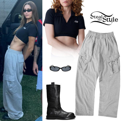 Hailey Baldwin: Black Crop Top, Grey Pants
