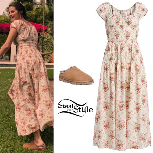 Selena Gomez shared a photo on instagram wearing Dôen Quinette Floral Midi Dress ($328.00) available at Nordstrom, Farfetch and Saks Fifth Avenue with Bearpaw Tabitha Slippers ($69.99) available here and here.