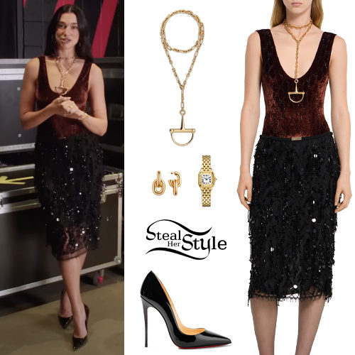 Dua Lipa appeared in a new Vogue video wearing GG Crystal Embellished Bodysuit and Embellished Midi Skirt (Not available yet) with Half Horsebit Necklace ($2,000.00) all Gucci, Martha Calvo Kylie Earrings ($140.00), Cartier Panthére de Cartier Mini Watch ($23,800.00) and Christian Louboutin So Kate Pumps ($795.00).