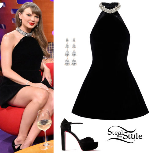 Taylor Swift appeared on “The Graham Norton Show” wearing David Koma Crystal-Embellished Halterneck Minidress ($1,875.00), Etho Maria Diamond Drop Earrings (Not available online) and Christian Louboutin Sandaloo Platform Sandals ($1,195.00).