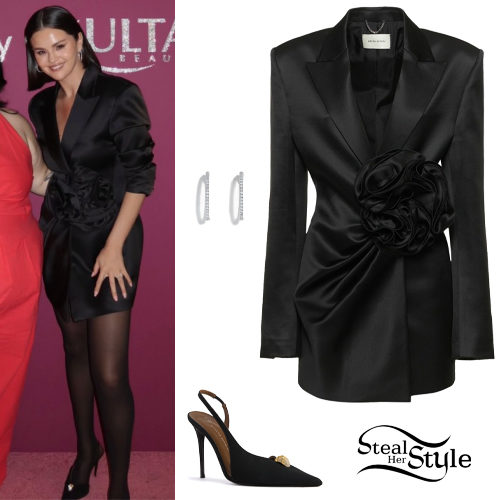Selena Gomez attended the launch of Rare Beauty at Ulta Beauty wearing Magda Butrym Wool Satin Blazer Dress (Sold out), Effy 14K White Gold Inside Out Diamond Oval Earrings ($8,400.00) and Giuseppe Zanotti Slingback Cocktail 105 Pumps ($1,150.00).