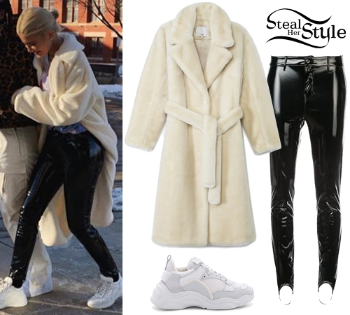 Kylie Jenner posted a picture on her instagram stories wearing a My Mym Made It Cream Faux Fur Robe Coat ($160.00), RtA Glossy Skinny Trousers ($264.00) and IRO Curverunner Sneakers ($596.00).