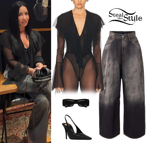 Demi Lovato appeared in a new AreYouOkay? video wearing Leather Cropped Bomber Jacket ($6,400.00) and Vendome Leather Slingback Pumps ($1,100.00) both Saint Laurent with EB Denim Low Rise Baggy Jeans ($295.00).