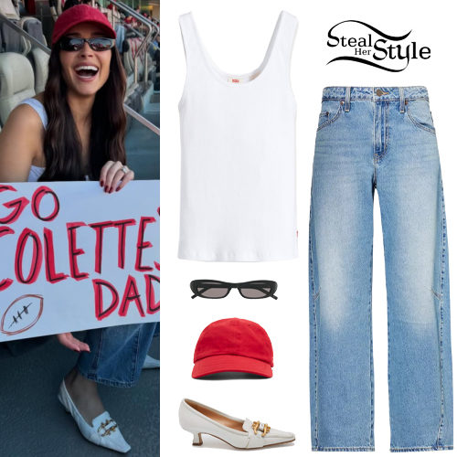 Olivia Culpo shared some photos on instagram wearing an Essential Rib Tank Top ($19.50) and Baggy Dad Barrel Jeans available here ($69.97) and here ($108.00) both by Levi’s, Jacquemus La Casquette Cap ($107.00), Saint Laurent SL 557 Slim Oval Sunglasses ($300.00) and Bottega Veneta Madame Pumps ($291.00+).