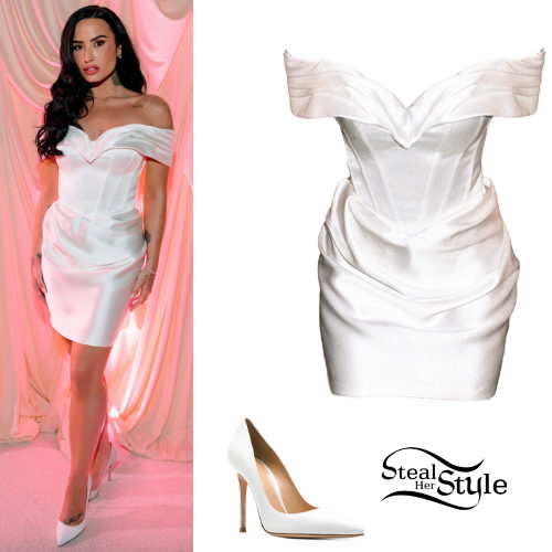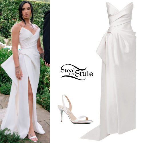 Demi Lovato tied the knot over the weekend with fiancé Jordan Jutes Lutes in a wedding ceremony on Sunday in California. For the ceremony she wore a customized Cocotte Gown available at Net-A-Porter ($8,000.00) and Luisaviaroma ($8,810.00) with a Classic Cathedral Veil ($1,320.00) and Vargas Platform Pumps ($602.00 – wrong color) all by Vivienne Westwood.