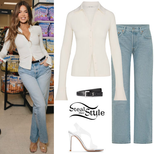Khloé Kardashian shared some photos on instagram wearing Eterne Charlie Top ($425.00), Levi’s 501 90s Jeans ($220.00), Saint Laurent Cassandre Leather Belt ($475.00) and Gianvito Rossi Metropolis PVC Sandals (Sold Out).