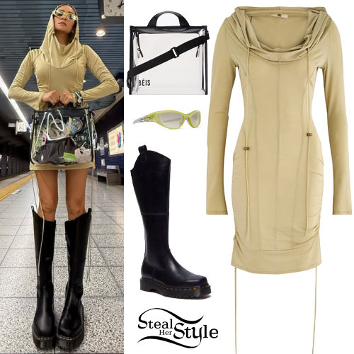 Shay Mitchell shared some photos on instagram wearing KNWLS Cu Hooded Dress available at FWRD ($480.00) and Revolve ($799.00), Béis The Stadium Tote Bag ($78.00), Gentle Monster Limitless SY9 Sunglasses ($370.00) and Dr. Martens Amaayah Knee High Leather Boots ($220.00).
