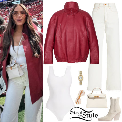 Olivia Culpo shared some photos on instagram wearing The Frankie Shop Zion Bomber Jacket ($388.00), Commando Butter Tank Bodysuit ($98.00), SLVRLAKE Grace Crop Jeans ($180.00), Hermès Kelly Sellier 20 Craie Epsom Gold Hardware ($38,500.00), Bottega Veneta Sardine Aviator-style Gold-Tone Sunglasses ($655.00) Paris Texas Dallas Ankle Boots ($845.00).