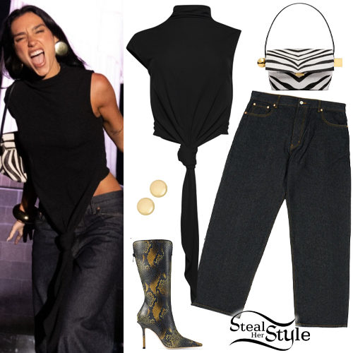 Dua Lipa shared some photos on instagram wearing Angelica Montini Knot Top Iris (€410.00), Palace P90 Baggy Jean ‘Indigo Wash’ ($497.00), Flavia Madeira Eclipse Earrings (R$2,420.00), Jacquemus Le Rond Carre Zebra Bag (Sold Out) and Jimmy Choo 2000 Python-Effect Leather Knee Boots ($1,795.00).