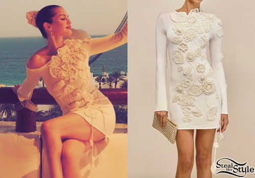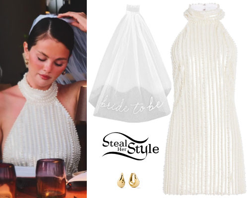 Selena Gomez shared some photos from her Cabo bachelorette party! She was seen wearing Yaeko Embellished Dress by Retrofête ($1,498.00) also available at Revolve and Net-A-Porter, Mejuri Dôme Figure Hoops ($248.00) and Fetti Bride To Be Veil ($15.00).