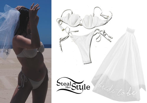 For this photo Selena is seen wearing Sunrise Shell Bikini Top ($130.00) and Lucia Bikini Bottom ($88.00) both LSpace and Fetti Bride To Be Veil ($15.00).