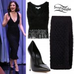 Camila Cabello wears two half-up buns and light waves on her long layered dark brown hair.