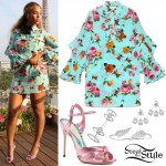 For the look she used: CERA VE Moisturizing Lotion, NARS Concealer, PÜR primer, Make Up For Ever Ultra HD Foundation, MAC Studio face powder, MAC blush, Anastasia Beverly Hills eyebrow pencil in caramel color, The BrowGal by Tonya Crooks, Lorac eye-primer, Urban Decay Naked 2 eyeshadows palette in gold beige, black pencil liner, black mascara and peach lipgloss.