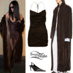 Rita Ora was spotted arriving at her home in London a couple of weeks ago wearing a Victoria Beckham Wool Coat with Chain Embellishment ($3,995), Saint Laurent Signature Biker Pants ($1,450), the Maison Michel Herietta Rabbit Fur Felt Large Brim Hat ($473.00) and a pair of Marni Chelsea Boots ($950.00). You can find similar pants at Saks Fifth Avenue ($79.90) and a similar hat at Dorothy Perkins ($25.00).